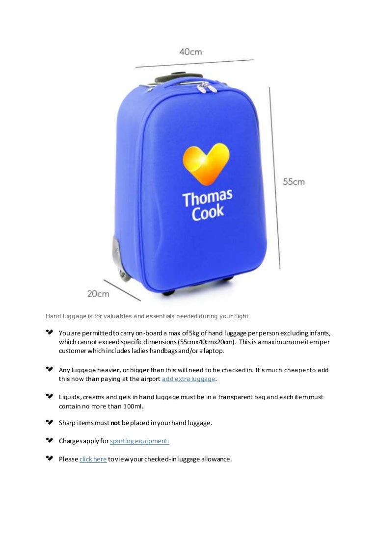 What baggage is included? : Thomas Cook Every airline has a standard hand luggage allowance, and this is included in our online prices. Please check your airline's website to see what maximum weight and size you can take into the cabin. For hold luggage, you'll be advised when you book whether this is included or something you need to add on at an additional cost.