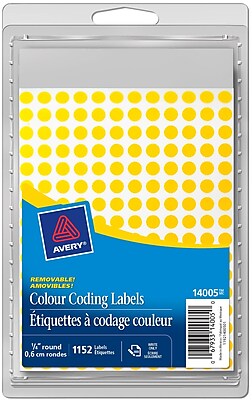 Avery Hand Written Color Coding Labels, 1/4" Dia., Yellow, 450/Sheet, 1 ... These Avery permanent round color-coding self-adhesive labels are bright-yellow and come in a 450-pack, so you can tackle large labeling projects. Color-coding labels are ideal for priority messages, color coding, and more. Round 1/4" diameter labels. Comes in yellow color. Features a permanent adhesive backing for a secure bond.