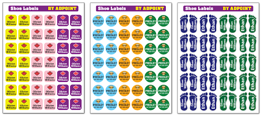 Personalised labels for kids' shoes | Fast delivery UK | Labels4Kids Our stick on shoe labels come in packs of 6, 12 or 18 pairs and you have a wide choice of colours and logos to personalise with. The shoe labels will not come off. Make sure you also check out our Right Foot labels, a clever way of teaching children left from right with your shoe labels.