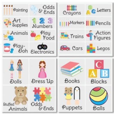 How to Teach Kids to Organize their Rooms with Free Printable Labels The following is a list of the labels that are included in this series of bin labels for organizing kids' toys. Rocket Castle Treasure Chest Doll Dinosaur Dress - for dress up clothes ruck Bear Interlocking brick system Ball Superhero Knight Books Princess Crown Car Chef Farm Animals Swords and weapons House Firestation Pattern Cards